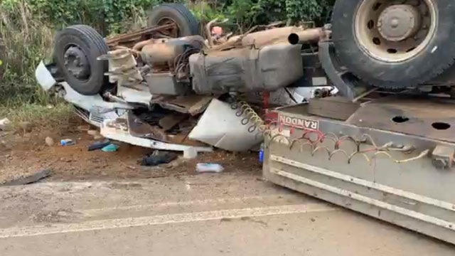 Carreta tomba. MILAGRE: Mais um acidente foi registrado na BR-421, desta vez com um final feliz. Segundo informações um caminhão carregado com estruturas metálicas para arquibancada usadas em festas seguia sentido município Monte Negro, quando na altura do quilômetro 19 a carga se soltou e o veículo acabou virando. Apesar do grave acidente e a destruição completa da cabine do caminhão o motorista sofreu apenas alguns ferimentos. É o que podemos chamar de um verdadeiro milagre de Deus.